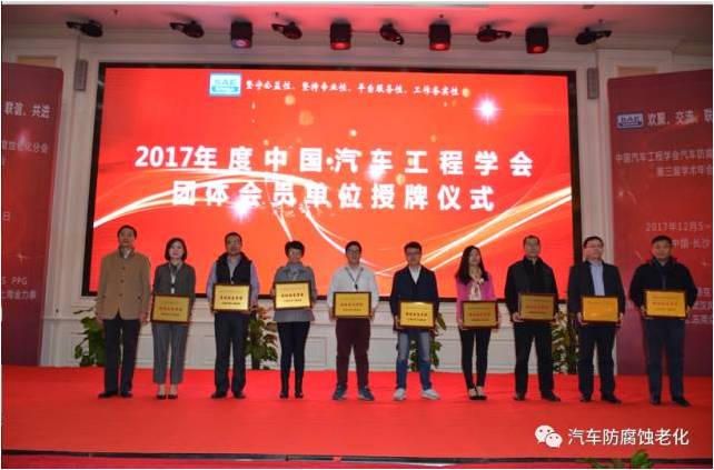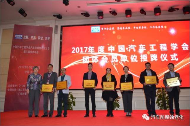The next is to issue the plaque of the group member unit of the China Auto Engineering Society in 2017. This year, a total of 35 units have become the member units of China Automotive Engineering Society automotive corrosion prevention and aging branch. Our affiliate has also become the most affiliated branch of China Automotive Engineering Society.